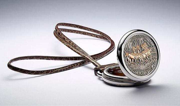 而在装饰工艺表现方面,爱马仕今年打造数款巧夺天工的怀表作品,而且每一款都独一无二;当中名为Arceau Pocket La promenade de Platon的怀表作品,一共三只,设计灵感取材自艺术家Annie Faivre笔下的「La promenade de Platon」真丝围巾,同时更呼应爱马仕2016年的年度主题「驰骋自然万物间」。在精心处理的怀表保护盖上头,金雕、内填珐琅、珐琅微绘等不同技法,栩栩如生的呈现了柏拉图最爱的Academus花园场景。