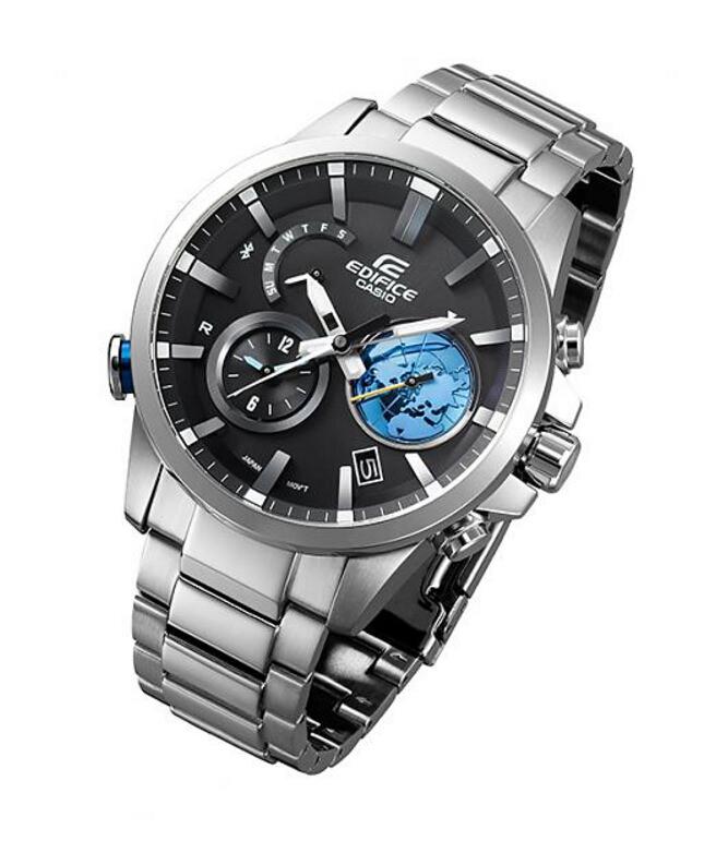EQB-600 由3点以及7点位置小表盘显示世界时间,3点位置小表盘采用独特3D地球设计,依靠卡西欧日本山形工厂先进制模技术打造,如同真实地球每24小时自转一圈,并在不同视角中折射出不同蓝色光泽。3D地球表盘内的弯弧指针,可指示时区位置、以及白天/黑夜信息。此外,通过智能手机还可设定闹铃、倒计时等手表功能,强劲太阳能驱动系统保证各种功能的稳定运转,让穿梭在世界各地的商务人士轻松掌握各地的世界时间。