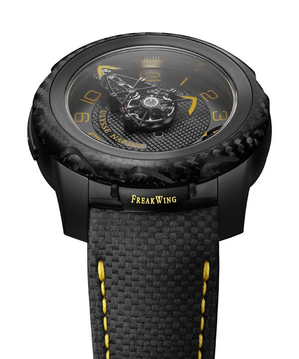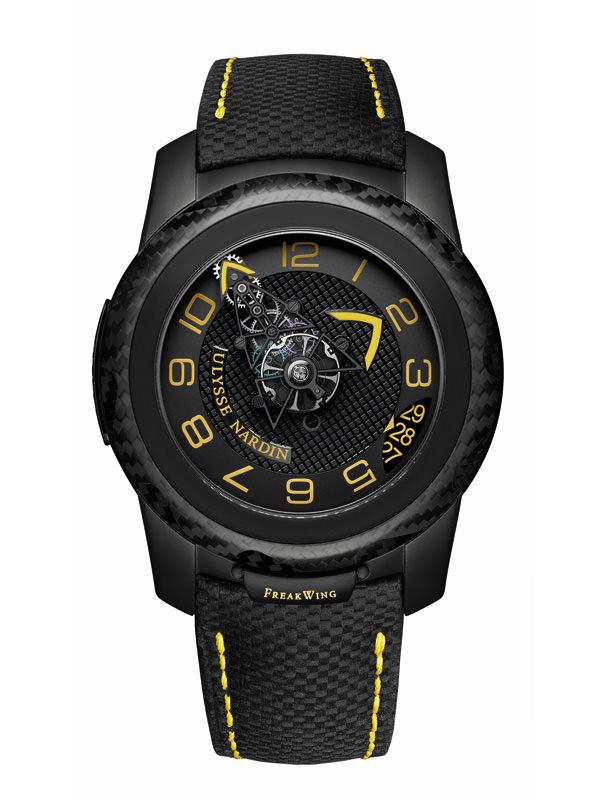表壳采用黑色類钻碳(DLC – diamond-like-carbon)钛金属制成,比以往更坚固,搭配黄色缝线的碳纤维格纹表带。《FreakWing 陀飞轮》的操作简易,腕表没有表冠,其上、下表圈与机芯结合执行各种功能:第一,在6 点钟位置表耳之间设有一个表圈安全锁定装置,顺时针方向转动可以设定小时和分钟,沿逆时针方向转动则可调校日期;第二,旋转腕表后底盖可以为主发条上链,发条盒专为八天动力储存而设。
