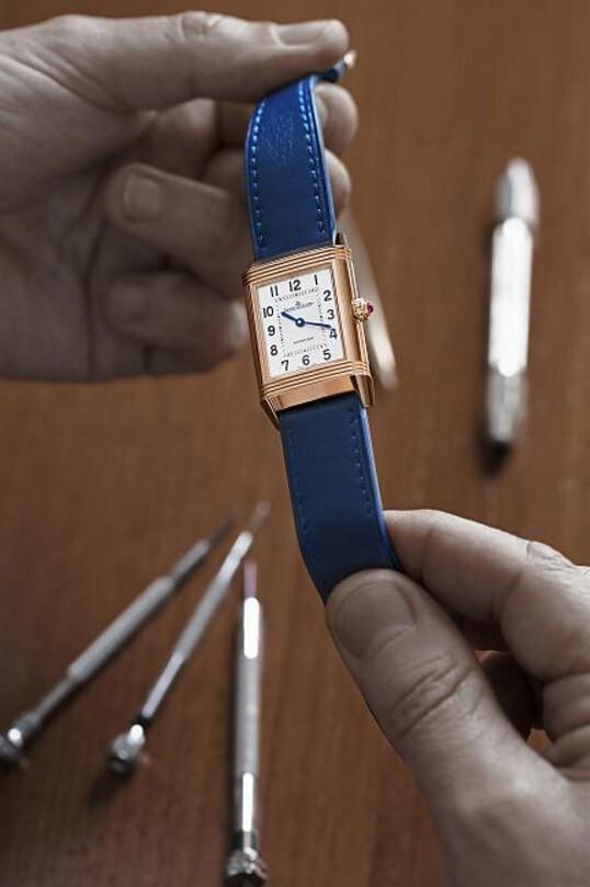 经典Duetto系列 -两枚背对背的表盘,虽然彼此的指针逆向运转,却是由同一枚机芯驱动,如此匠心独具的巧思,搭配其装饰艺术的设计灵感,实在令人心醉神迷。除了可翻转的防护功能,在翻转表壳时显露出的表背,克莱尔通过客制化订制,刻上她的家徽,小孩的名字缩写,以及两个马球槌。将围绕她生命里重要的两个核心:她的家人和她的热爱的马球运动,紧密承载于手腕间。而红宝石表冠则象征着胜利,分享和爱的寓意。