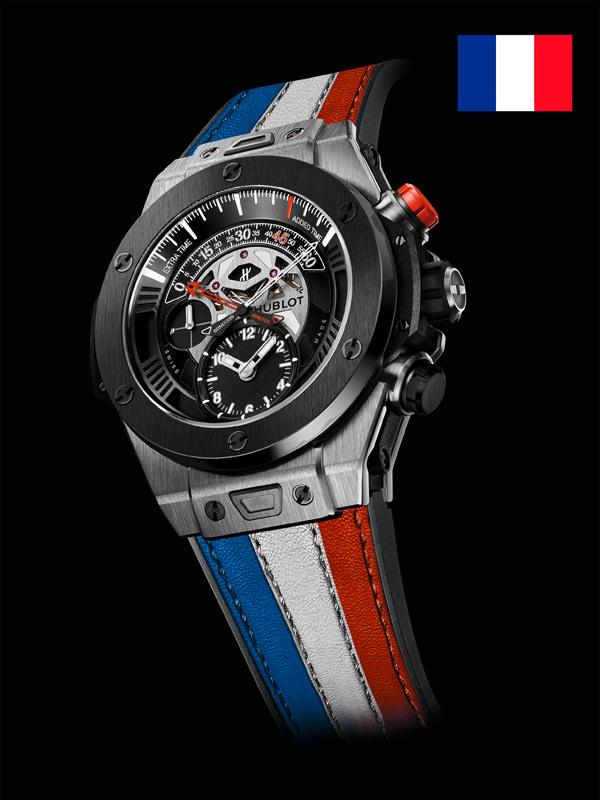 2016年,欧洲杯(UEFA EURO 2016™)于6月10日至7月10日在法国隆重举办。这是宇舶表与欧洲杯的第三次合作,此次,宇舶表特别推出2016年法国欧洲杯官方腕表。Big Bang Unico逆跳计时腕表炫酷的设计风格与热情的足球运动相得益彰,无处不彰显足坛魅力,以第十五届欧洲杯主办国法国的标志性色彩为灵感来源,采用红白蓝配色,限量典藏100枚,即将发售。其45毫米直径的黑色陶瓷表壳搭载“一键式”(One-Click)快速更换表带机制,蓝色鳄鱼皮表带下衬有天然橡胶以及红白缝线。