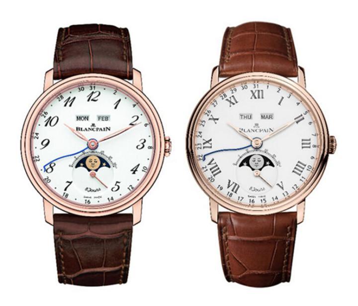2016年巴塞尔国际钟表展上,宝珀发布了Villeret经典系列新款八日长动力全历月相腕表6639A,经典的罗马数字刻度被替换为阿拉伯数字刻度,阿拉伯与古罗马的文明之争在表盘上再次上演。