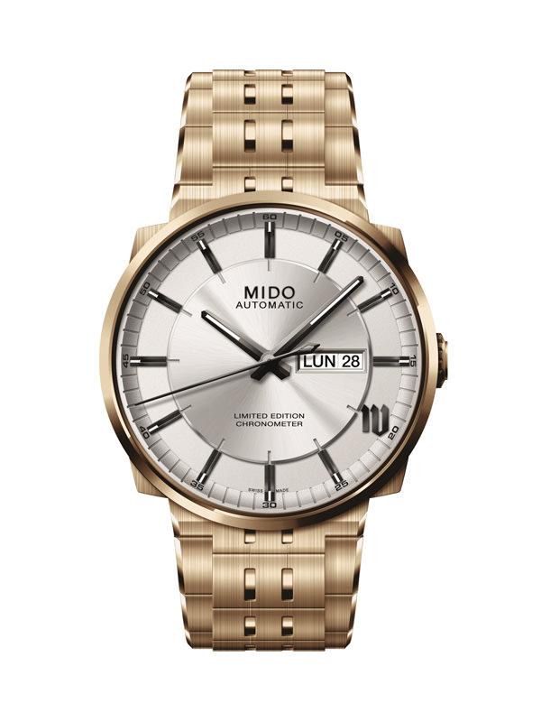 机芯:美度Caliber 80长动能存储天文台认证的全自动机械机芯(以ETA C07.621为基础),11½’’’,直径25.60 mm,厚度5.22 mm,25钻,21,600次摆幅/小时。精雕细琢的机芯饰以蓝色螺丝,自动摆陀精心雕刻大本钟表盘图案和MIDO标志。时分秒日期星期显示。最高可达80小时动能存储。