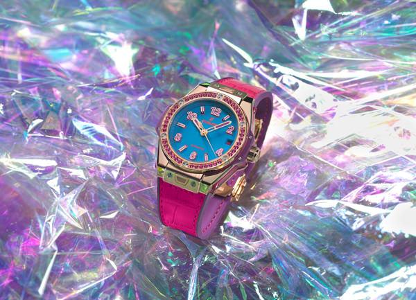 为纪念宇舶表Big Bang腕表38毫米诞生8周年,宇舶表以全新设计的Big Bang“一键式”腕表39毫米再次闪亮面世。表壳直径原为38毫米的宇舶表Big Bang腕表拥有镶钻表圈,专为女性量身打造。而新款腕表将表壳直径增加至39毫米,并融入始于2013年的Big Bang Unico腕表的设计元素。螺钉、表冠、时标和数字均被赋予全新格调。整体线条更为紧凑,呈现更为果敢坚毅的女性魅力。腕表更搭载“一键式”表带,彰显百变风格。“一键式”(One-Click)快速替换表带系统是宇舶表将表带与表壳连接的一个专利机制,使佩戴者轻松实现快速更换表带。Big Bang“一键式”波普艺术腕表39毫米也搭载该专利技术,为其百变风情更添魅力。