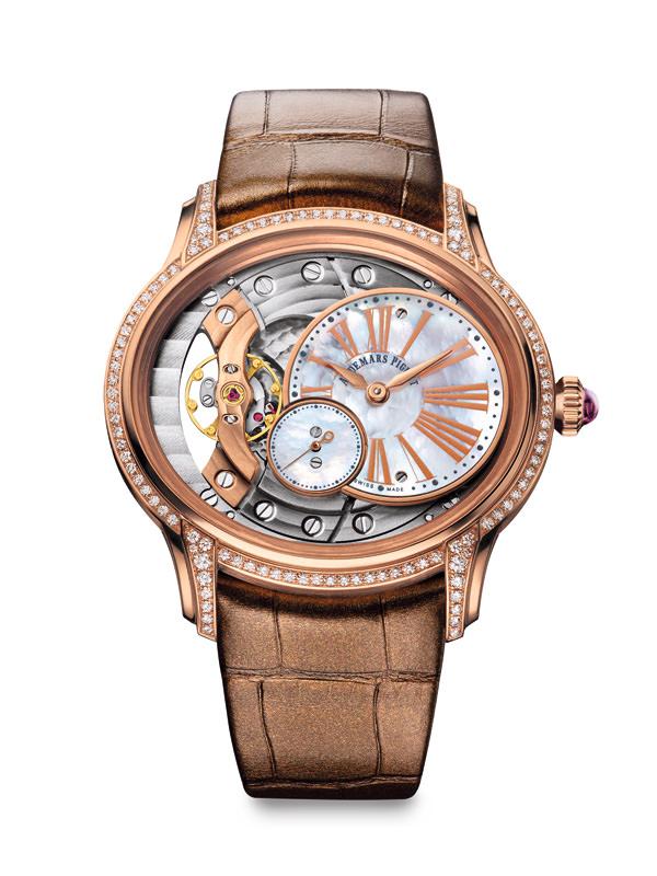 在千禧系列问世20年后,爱彼再次以原创精神呈现全新设计,呼应现代、独立的女性生活方式,诠释出佩戴者突破常规、不拘一格的独特个性:偏心时、分表盘结合珍珠贝母材质或宝石镶嵌,将高级制表技术与传统镶嵌工艺巧妙结合,成就千禧系列女装腕表的独特风采。为椭圆形表壳特别设计的椭圆形机芯,采用独立摆轮及夹板设计,从表盘即可一览机芯的运转之美。而2016年,千禧系列女装腕表又添一款全新现代风格设计。