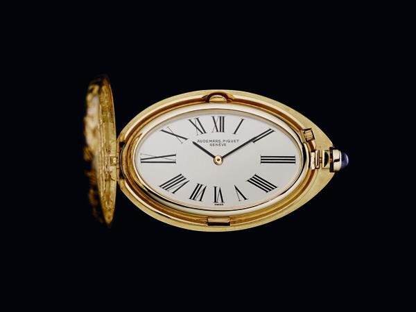 1971年,爱彼制作的18K黄金怀表采用猎表表壳设计,将横向椭圆造型设计推向极致。银质表盘配以放射状罗马数字时标,以突出椭圆设计,内表壳通过铰链与外表壳连接,搭配凸圆形蓝宝石表冠。这枚腕表搭载爱彼自主制造的Calibre 2003机芯,厚度仅有1.64毫米,是世界上最纤薄的机械机芯。