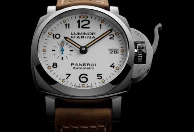 全新Luminor Marina 1950 3 Days Automatic Acciaio 腕表配搭白色表盘,表壳则备有42毫米直径(PAM01523)或44毫米直径(PAM01499)两款。表盘设有数字及圆点时标,3点钟方位设有日期显示,而9点钟方位的小秒针以沛纳海深蓝色呈现,与系列其他型号的装饰细节一脉相承。Assolutamente棕色皮革表带不经化学程序加工,浅褐色撞色缝线饰边完美呼应着表盘上于黑暗中清晰显示时间的Super-LumiNova ®夜光色泽。