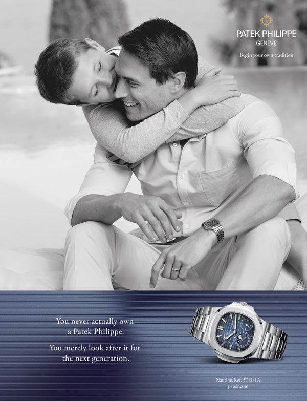 这一创新理念的完美视觉呈现,有赖于摄影师正确表达父子或母女之间的亲密关系。那是两代人的共处时光,是共同学习与分享的亲密瞬间,例如四指连弹、首次打领结、第一次剃须、父子两人外出垂钓、一起参加体育运动、眼神的交流,这些温馨而珍贵的时刻能让每个人产生共鸣。最终,数十个这样的场景通过黑白照片呈现,配上极富感染力的广告语“没有人真正拥有百达翡丽,只不过为下一代保管而已。”腕表本身则低调地融入画面中。