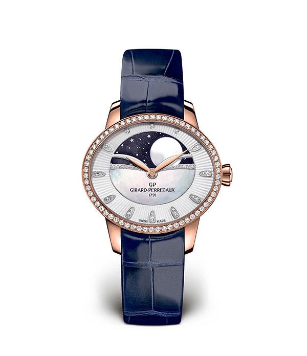 秉承一贯的制表理念,此款新作搭载GP03300-0125型自动上链机芯,由GP芝柏表以最精良的瑞士制表传统设计、开发和制造。这款拥有240个零件的机芯,其动力储存高达46小时,因其卓越的装饰工艺更显与众不同,配有日内瓦波纹和圆形纹饰的主板、蓝钢螺丝以及印有“GP”标记的自动摆陀。彰显品牌一贯的美学标准,GP芝柏表猫眼系列星光夜空月相腕表搭配玫瑰金表带或午夜蓝色的鳄鱼皮表带,在熠熠星光中点亮夜空。