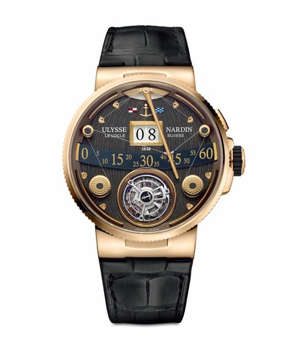 2017年,在瑞士的勒洛克,Ulysse Nardin 雅典表推出暖色调的Grand Deck大航海旗舰陀飞轮,采用5N玫瑰金表壳,限量发行18枚。