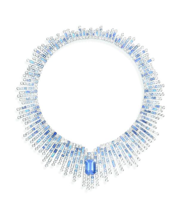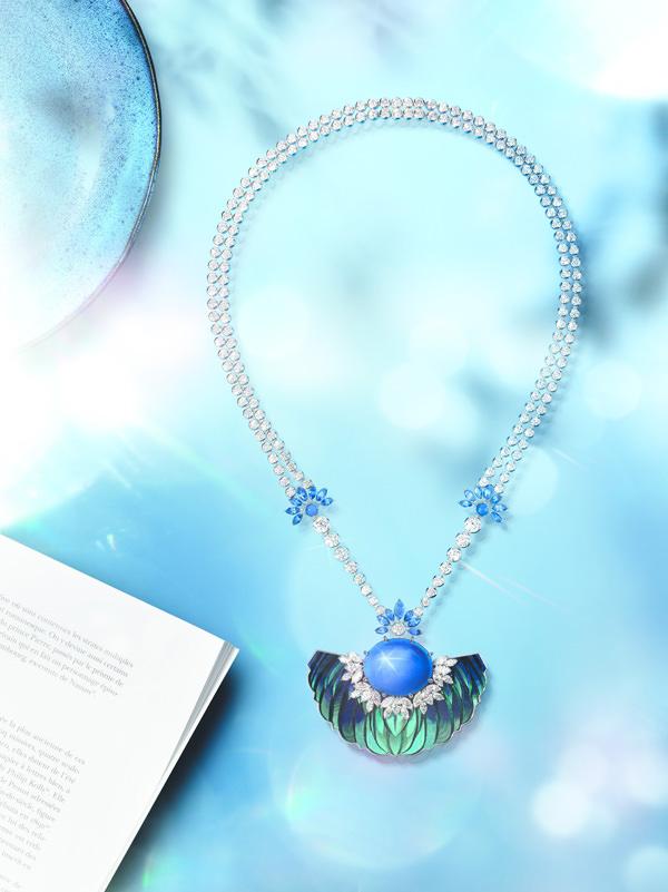 各种自然元素在旭日的映照下幻化成如斯动人美景,带来一系列迷人炫目的艺术作品。耳环 (G38N2800) 呼应遥远孤岛的地貌,迷失于大片黑色蛋白石的海洋当中,邀请你一头栽进炎夏风光中。长项链缀以蓝色马眼形切割宝石、钻石及羽毛,镶嵌一颗45.99克拉*的蓝星蓝宝石,非凡夺目,闪闪生辉 (G37N2000)。午间泳客戴着这条匠心之作,自信满满地在海边昂首信步。徜徉在沙滩椅上的年轻女郎把玩着项链,椭圆形切割的锡兰蓝宝石闪烁璀璨 (G37N2300)。闪耀的钻石洒满项链,仿若日光照射海面时的粼粼彩光,似是邀请她海边漫步。