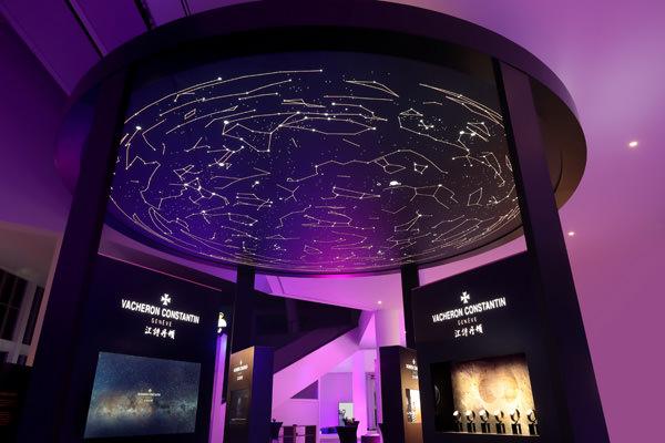 充满天文元素的时计观览展厅呈以丰富的影像和腕表杰作。三幅古董天文时计图片彰显出品牌的悠久传承。江诗丹顿各系列的天文腕表亦以生活化图景于空间内递次纷呈。天文腕表的圆形展厅之上,呈现了一幅1755年9月17日当晚日内瓦上空的星空图,这正是由巴黎天文台根据江诗丹顿诞生的时间和地点推算而得,与展厅内的天文复杂功能时计熠熠辉映。宾客们也可于现场率先一睹全新Métiers d’Art艺术大师系列Copernicus Celestial Spheres哥白尼天体球2460 RT腕表的风采。