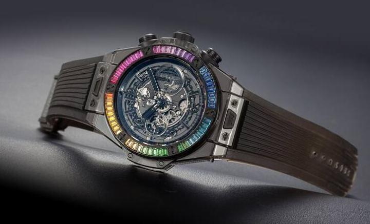 2017年对HUBLOT而言,可说是蓝宝石水晶材质腕表的一年。虽然以蓝宝石水晶材质作为表壳的品牌不少,像是RICHARD MILLE、GREUBEL FORSEY、BELL & ROSS到ZENITH都推出过水晶表壳,不过它们皆是透明水晶表壳,而HUBLOT旗下表款种类多,蓝宝石水晶材质的变化也是目前钟表界中最多元的,除了透明水晶,还有黑、蓝、红色,呈现蓝宝石水晶表壳更多元的面向,也同时展现品牌的制表实力。玩转创意很有一套的宇舶,继之前的Big Bang Unico蓝宝石计时码表彩虹版之后,这次又推出了另一款彩虹版的的Big Bang Unico All Black蓝宝石计时码表。黑到底的酷帅风格加上各色宝石的点缀形成超亮眼对比。