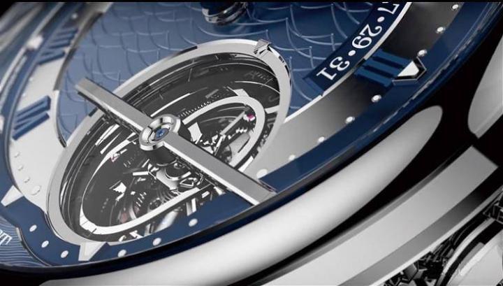 2017年的BASEL展中,宝玑再替Marine注入新血,有点出乎意料的是,这款新作Marine Équation Marchante 5887不只结合了多重复杂功能一举创下系列的新高度,少见搭配皮质表带的作法,也让这款表的正装味益发强烈。5887于外壳采用的铂金(另有玫瑰金款)材质就已经与一般的运动表有所区隔,而面盘设计更是跳脱了过去Marine系列的既定框架、处处充满新意,例如面盘外缘有带有几何立体感的蓝黑条纹,面盘内圈则有波浪状的机刻纹路,深蓝与银色的整体色调让人一眼即识该系列的海洋风格。