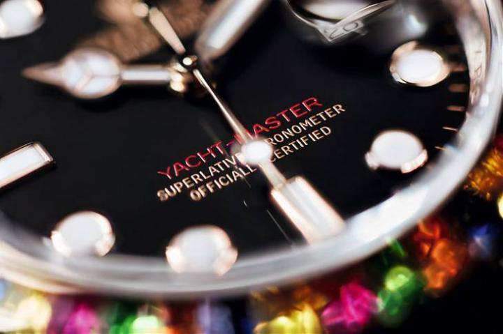 原本Yacht-Master的双向旋转表圈隐隐带有潜水表的下潜计时机能,但是比起更专业的潜水表系列来说,Yacht-Master在这方面的实用性相对较低,2017年新款正是善用了这部分空间加以做文章。劳力士挑选了矩形彩色宝石以及碧绿榴石逐一镶填在表圈上(依照红、黄、蓝、橘、绿的色彩顺序循环排列),值得一提的是,原本表圈上12点方向的倒三角标记,劳力士特别改用三角形钻石取代,让表圈不只是光彩夺目,同时还是保有原本实用性质的作用,另一方面由此也可突显出品牌在宝石加工以及镶嵌工艺上的优势。