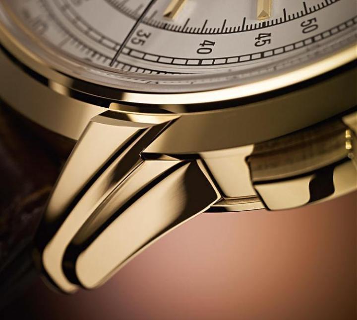 而为了便于区辨计算成果,表款的计时秒针另以经黑化处理的Pfinodal合金制成,与肩负走时功用的时分针便不致互相干扰;同时出于相似的出发点,表款位于脉搏计之内的立体切面时标则与指针选用相同K金材质,以突出置身黑白两色为主的面盘与计量刻度间的识别效果。过往三种主流延伸计量刻度常见以流速计和测距仪的双人舞、或以各自独立形态搭配计时的双眼/三眼格局,Ref. 5975则是提出了独到的见解,将计时码表的功能性推升到极限,演绎出更精彩耀目的赏表逸兴。