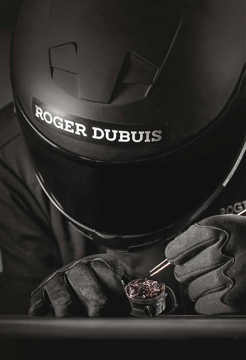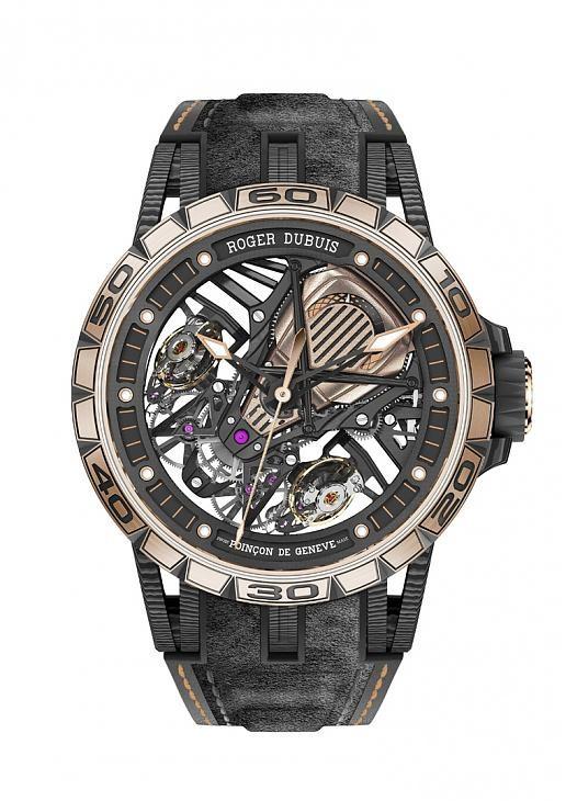 罗杰杜彼希望联名腕表的外观设计,能让人联想起兰博基尼给人的第一印象,为了将超跑的迷人风情浓缩在Excalibur Aventador S玫瑰金腕表,特别以经典超级跑车「大牛」为灵感,换上「黑金」玫瑰金表圈,更显霸气尊贵。此表在轮胎式的玫瑰金表圈和复层碳纤维表壳上,融入身价2700万台币的Aventador S跑车的设计元素,所搭载的双擒纵机芯,灵感取自Aventador S超跑引擎和Huracán Super Trofeo EVO车款造型,并结合罗杰杜彼拿手的「星辰镂空」概念,腕表彷彿配备着镂空的引擎盖,镂空面盘可直接看到机芯夹板,从视觉彷彿能感受驰骋的速度快感,别有趣味。承载着激昂热情的Excalibur Aventador S玫瑰金腕表,时分秒针均采用醒目的色彩强调,搭配覆有白色SLN夜光涂料的镀铑刻度,确保光线不足的黑暗环境下保有良好的判读性。