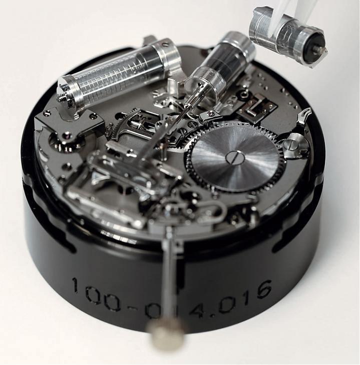 机芯内部采用蓝宝石水晶声音系统,采风箱式设计。音管为蓝宝石水晶,坚硬耐磨;活塞采碳材质,能减少摩擦。活塞用于泵吸、储存空气,制造报时声音。