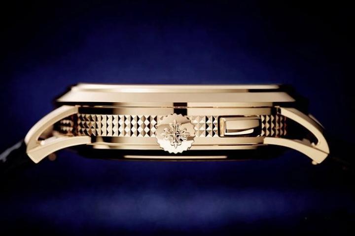 Ref. 5531世界时间三问腕表厚十一毫米,18K玫瑰金表壳线条却苗条优雅,全赖表身三项精工特色,包括表耳镂空有致,斜面表圈和镜面形状,减轻了腕表厚重感觉。表身由人手添上百达翡丽时计典型饰钉图案,左边表侧设有打簧滑动杆,用以启动三问装置,亦以同一图案润饰。时区按把位于二时位置,经打磨加工,增添表身光感层次。
