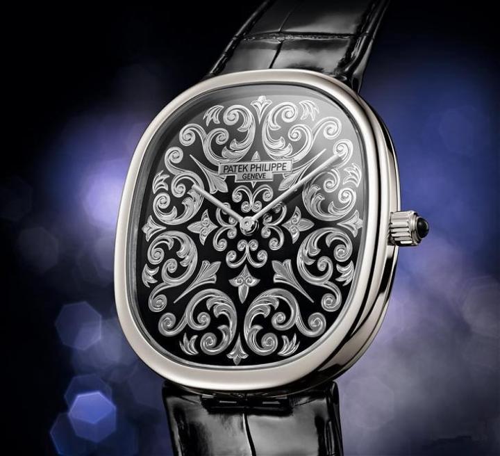 Ref. 5738/50P-001腕表表面黑色珐琅底层犹如背景,映衬18K白金底板上的人手精雕螺旋图案。表面中央由雕刻大师勾勒多时,带来如此精致的装饰成果。表面与Golden Ellipse鲜明俐落的线条融和无间,突显黄金比例营造的和谐感觉。精巧白金发状指针经磨式加工,追踪时分流逝。