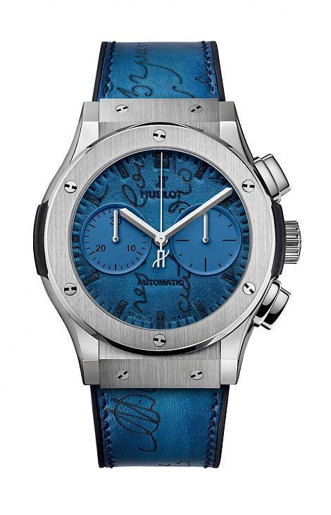 HUBLOT宇舶再次携手皮革世家BERLUTI打造出经典融合系列Berluti Scritto计时码表,腕表采用皇金或钛金属表壳,并搭配勃根地红或地中海蓝皮革面盘,将顶级皮革的质感永远留存在腕表上。