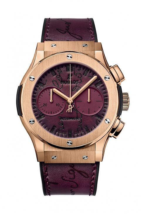 宇舶与BERLUTI的联名系列继续发展中,2018年新款依旧采用后者著名的Venezia Scritto皮革,并推出「勃根地红」和「地中海蓝」两种面盘新色