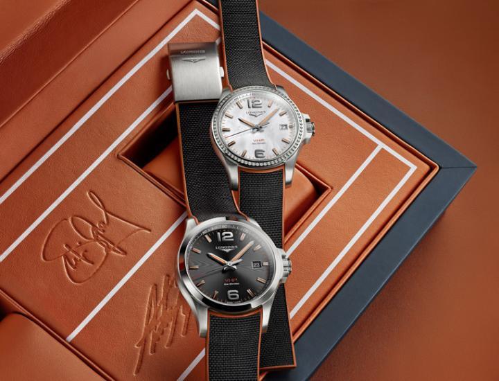 「Conquest征服者系列V.H.P.葛拉芙&阿格西基金会特别款」男士表款为黑色面盘,女士款则为白色珍珠母贝面盘,表壳镶嵌精致的70颗钻石。LONGINES为了向担任官方计时的法国网球公开赛致意,两款腕表的指针、时标和橡胶表带皆以橘色点缀,来象徵巴黎经典的罗兰高地红土球场。两款表的背盖皆有隽刻标志,男士款为”The Andre Agassi Foundation for Education”,女士款为”Children for Tomorrow”。最后,特别设计的腕表收藏盒亦采用法国网球公开赛的色系,其盒内珍藏着编号1至10的两款独家设计腕表。