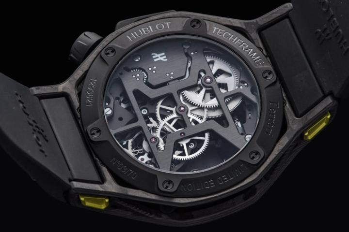 聚合物碳纤维材质/HUB 6311手动上链机芯/时、分显示/飞行陀飞轮装置/单按把计时码表功能/蓝宝石水晶镜面、透明底盖/防水100米/表径45mm/限量70只/参考价:950,000 RMB
