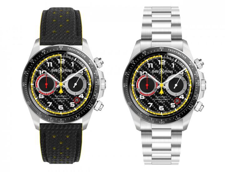 BR V2-94 R.S.18计时表可以配衬两款表带,分别为仿碳纤维纹理打孔小牛皮表带配黄色衬里,或者是缎面打磨不锈钢链带。这款计时表的设计及色调配搭,令精确计时功能显示更清晰;限量推出999只,势必被时计收藏家及一级方程式赛车迷热烈追捧。