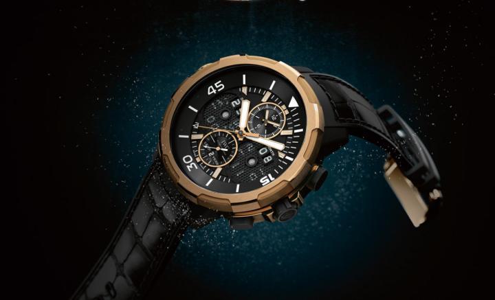 表款搭载的89801自动上链机芯由474枚零部件构成,其双棘爪上链机制能够提升上鍊系统的效能达30%,可在短时间内累积长达68小时的动力储存,上链效率更加优异。内置的飞返计时功能在进行连续计时时,免除了传统需停止再归零的麻烦,得以随时开始新的计时,潜水时,此显示还可监控上升速度。值得一提的是,IWC特别将日期与月份窗设计成圆格网纹,用意在于方便佩戴者欣赏复杂的切换机制,这项设计灵感源自水下交通工具的现代过滤系统,与海洋连结的设计元素,极具意义。