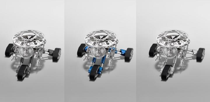 尽管Grant的时间走得相对较慢,但他却能在崎岖不平的路面(或是杂乱无章的书桌上)迅速灵活移动,这全归功于三条橡胶履带的设计。同时,Grant也能变换三种不同模式:底盘朝下水平趴卧为低姿态、或以45度角蜷伏,或是呈90度角坐直。Grant的时间显示盔甲也能弹性调整到最舒适的阅时角度。