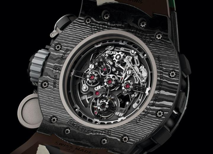 RM 25-01防水深度达100米,配有两组可替换表圈。第一组是经DLC涂层处理的5级钛合金指南针表圈,配有固定式及可旋转式表圈各一个。面盘上配有卡榫,可将其快速方便地固定在表壳上。TPT®碳纤维表盖反面镶有镜面,并在12点位置刻有一个凹槽,以提高指南针的瞄准精度。其蓝宝石水晶採用多层抗反射处理工艺,并採用防磁涂层,防止机芯和指南针相互干扰。位于4点钟位置的水平仪可检查腕表是否完全水平,使测向更加准确。指南针可从表上卸下,安装在一块TPT®碳纤维材质的板上。该配置提供了诸多实用功能,例如专用于指示方向的刻线,在使用地图导航时,非常适合用它来定向。第二组是TPT®碳纤维和钛合金制成的双向日间表圈,并配有24小时刻度、360°刻度盘以及基本方向指示。无须进行任何计算,只要将时针面向太阳并转动表圈,24小时刻度盘上就会显示出当地的时间,完全不受南北半球的影响,可以毫不费力地辨别东西南北。