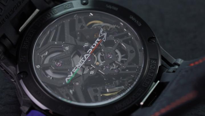 与一般跨界合作的联名款式相比,ROGER DUBUIS和LAMBORGHINI的双强携手可不仅止于改改既有款式的配色和压压车厂Logo便交待过去,这个联名系列每款的发行数量都不多(最少8只,最多88只),加上腕表身价各个不凡,因此罗杰杜彼可以说是端出了满满的诚意来制作。最令人惊叹之处在于品牌特地为了这款Excalibur Aventador S开发一枚全新机芯——除了外观部分可从发条盒上方仿造超跑引擎室拉杆设计的机芯桥板嗅出这种“量身打造”的味道,就连功能性上也有新的进展,采用两枚分别倾斜约45的双摆轮连动,以促成更精准地走时表现。过往罗杰杜彼曾经先后推出过双飞行陀飞轮以及四擒纵系统的作品,对于该如何连结、调配复数擒纵系统有着丰富的经验和技术作为后盾。此次的双擒纵系统看似未突破过往的技术复杂度,但其实罗杰杜彼首次导入跳秒设计于这枚RD103SQ机芯中,搭配经过差速器连结的双擒纵系统,每小时可以合力输出57,600次的震频,使得秒针跳动的规律更为细腻精准。翻至表背首先会发现透明底盖上印有”Aventador S”字样,接下来机芯的镂空、打磨修饰也能尽收眼底,并借由底板上日内瓦印记的佐证,显示出机芯的品质与性能都通过了严格的标准检验。