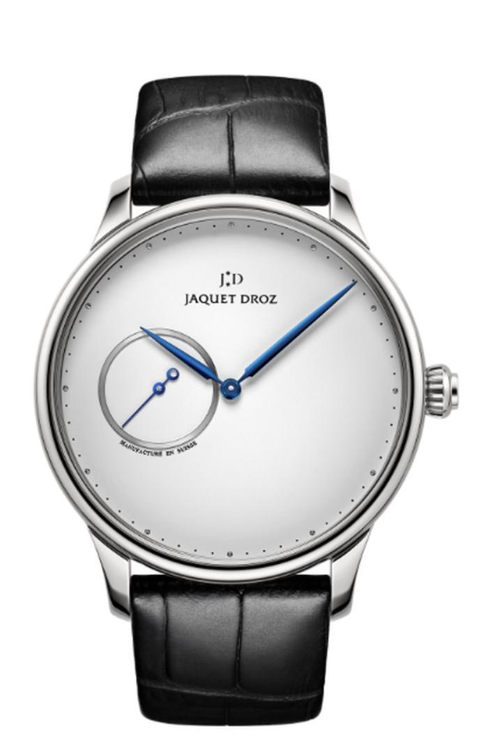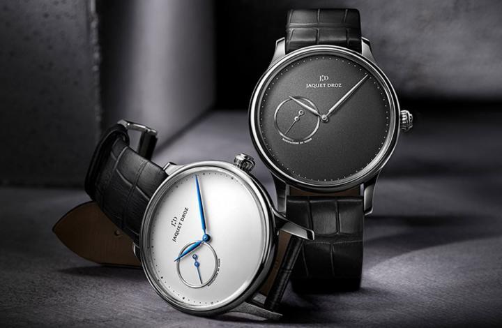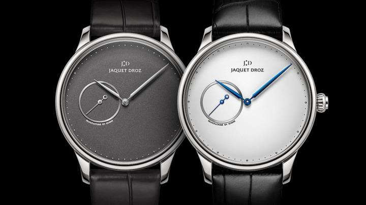 两款腕表简约纯净,面盘上仅显示基本时间资讯:时、分、秒。设计低调的分钟刻度圈记录时间流逝。雅克德罗在分钟刻度上,每隔五分钟便装饰一颗精致的镀铑铆钉,为腕表巧妙增添一股立体感。此外,表缘亦经镀铑处理,为分钟刻度圈赋予细腻幽微的银色光泽。9时位置设有品牌经典的偏心秒盘。秒针末端装饰偏心圆环,让人联想起天体公转,借此向星辰系列致意。