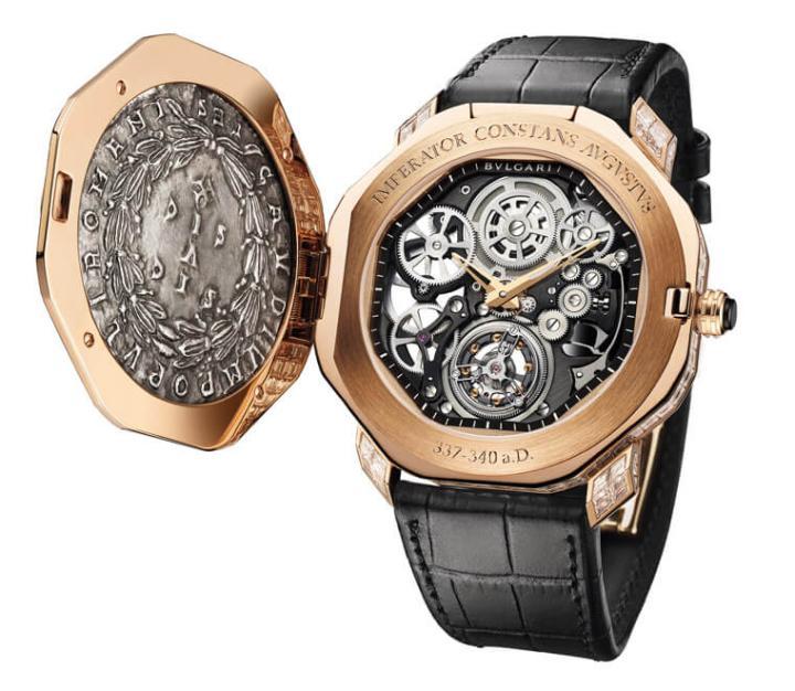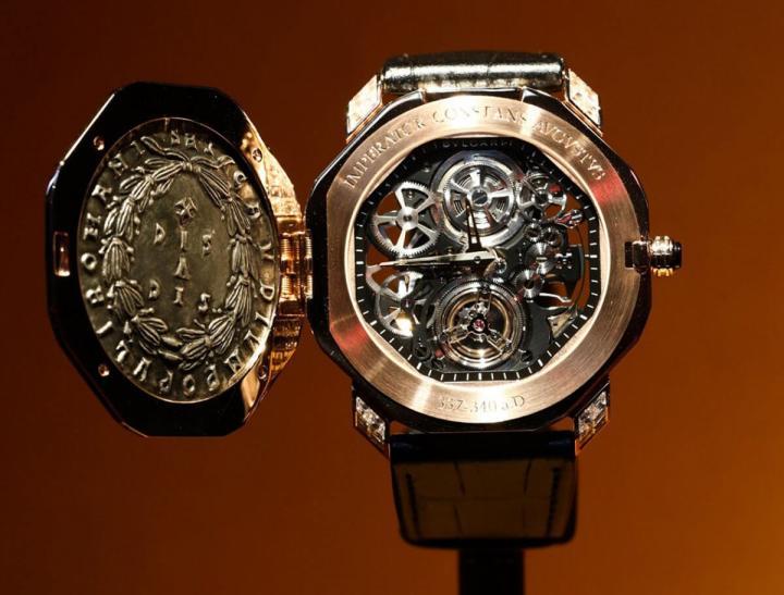 18K玫瑰金材质/BVL 268手动上链机芯/时、分显示/古币装饰前盖/表款镶钻/蓝宝石水晶镜面、透明底盖/表径44mm/限量1只/参考价:约 5,590,000 RMB