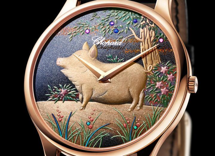 自从2012年龙年以来,瑞士表厂好像被触动了制作生肖表的开关,一时之间有很多品牌陆续推出自己的生肖表,毕竟龙在华人心中具有崇高神圣的地位,从龙年开始制作生肖表似乎也就没那么难理解。在制作生肖表的各家表厂中,CHOPARD萧邦显得很有自己的特色,因为他们的生肖表一向惯用同样源自东方的技艺来表现——日本传统莳绘工艺,这次的农历猪年品牌也依旧不缺席,结合稀有的莳绘工艺,在手表面盘上呈现一只可爱中带有勤奋欢乐寓意的金猪图案。