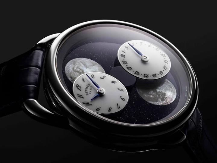 设计师Herni d’Origny在1978年替HERMÈS爱马仕设计出具有不对称表耳的Arceau表壳,如今变成品牌2019年新作L\’Heure de La Lune月读时光腕表的舞台,以陨石或砂金石打造的面盘是最浪漫的主角。而两个绕着盘面运转移动的白色或灰色漆面副表盘,装饰着斜体阿拉伯数字,为日期与时间写下优美符号,随着搭载于爱马仕自制机芯中的独创模组的节奏,如在太空中飘浮般的缓慢旋转,显露简约而又极具图形美感的读时方式。
