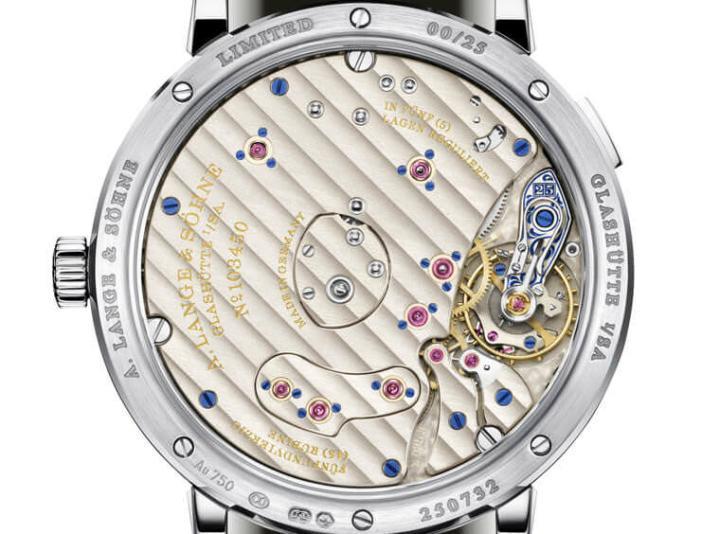 有别于Lange 1 “25th Anniversary”纪念表有军官式底盖设计,Grand Lange 1 Moon Phase “25th Anniversary”搭配的是纯粹的透明底盖,因此我们一翻到表背就能看到许多德国表厂才有的制表工艺特色,例如3/4德国银夹板上采用格拉苏蒂纹装饰、鹅颈式微调,以及摆轮桥板上的雕花等等,这次的25周年纪念系列除了面盘细节与表带换上蓝色之外,摆轮桥板也加上蓝色涂层和模仿大日期视窗的”25”字样以此呼应周年主题。而25这个数字又跟朗格在1994年宣布复出表坛的典故有关,当年品牌在10月24日发表新款,为了让媒体记者在隔天见报时手表能显示出当天的日期资讯,所以朗格一律将新表的日期显示调至25日的位置,这个传统延续至今成为品牌的一大特色,而随着第二款Lange 1家族25周年纪念款的推出,朗格也宣布2019年从一月开始到十月,每个月都会发表新款的纪念表,只能说这梗铺得真是长。