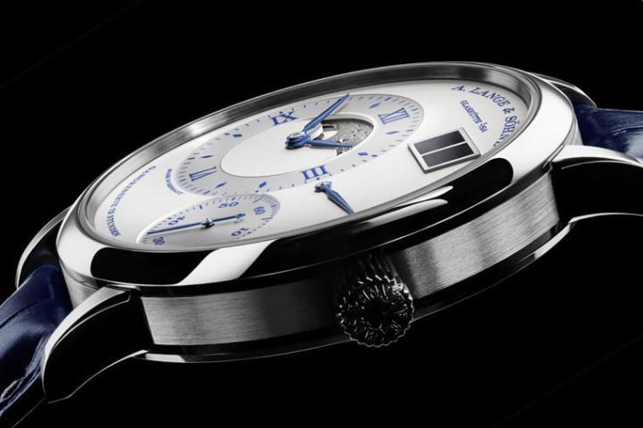 18K白金材质/L095.3手动上链机芯/偏心时、偏心分、小秒、大日期显示/动力储存显示/月相显示/蓝宝石水晶镜面、透明底盖/表径41mm/限量25只