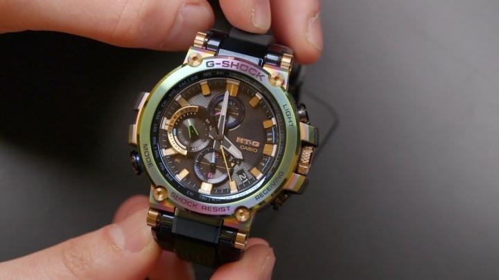 源自于利用金属和树脂的概念,卡西欧于1999年11月首次推出MT-G系列。全新MTG-B1000RB是纪念MT-G系列20周年的限量纪念版,表圈采用彩虹离子电镀,跃动地折射出不同颜色的光线,唤起“黑夜彩虹Lunar Rainbow”的概念。
