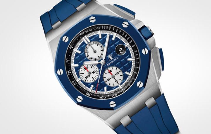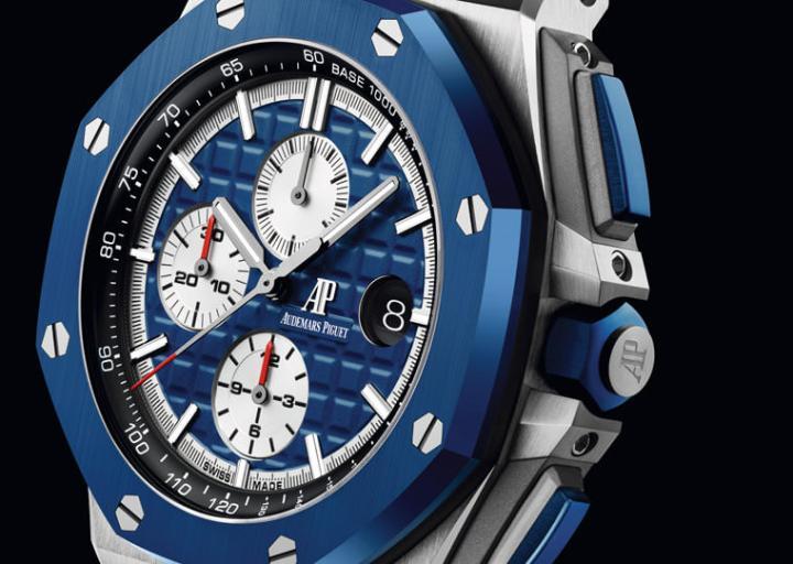 皇家橡树离岸型计时码表过往不论是42mm还是44mm版本,整体的配色都还是偏向传统保守,顶多就是异材质表壳加上双色面盘,不过近年爱彼在潜水表系列上就已慢慢开始挹注更多大胆的配色让人耳目一新,2019年新款的44mm ROO计时码表有意无意间似乎也感染了这股年轻自由的气息,首先它是系列目前仅见采用蓝色陶瓷表圈的处女作(包括按把与表冠等处也都是蓝陶瓷),搭配蓝色面盘整个很有海洋风的活力,光是这些细节就已经让这款显得与众不同。