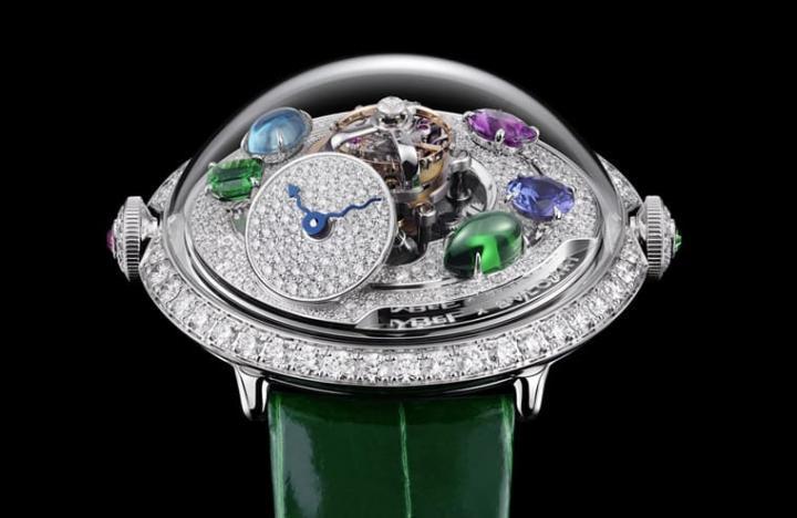 确立好手表的机械特征后,接下来的外观修饰便轮到宝格丽一展长才,品牌一方面将表壳重新设计,同时又要精准拿捏彩色宝石的尺寸使它们能融入拱形蓝宝石水晶镜面内部的机芯结构上。宝格丽分别在表壳、面盘与偏心小表盘上镶满美钻,另外又在面盘外缘的位置分别镶入碧玺、沙弗莱石、钻石、红碧玺、紫水晶、坦桑石与拓帕石等彩宝;宝格丽精心构思宝石排列组合,让它们可以达到类似渐层的合理色彩布局,甚至连宝石本身的切工也经过品牌的深思熟虑,在Legacy Machine FlyingT Allegra的面盘上可见数颗采用蛋面切割工艺加工的宝石,用意其实也是在呼应手表外壳的浑圆造型。