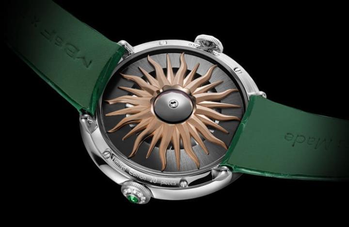 手表搭载的机芯为垂直同轴的形式,并以3D立体结构呈现一般通常隐藏在面盘下的精密机械零件,面盘轴心顶端可见中置飞行陀飞轮不停自转的养眼画面,陀飞轮还特别连接一个刻意倾斜50度的偏心表盘——目的是提供只有佩戴者才能清楚看见时间的视角。