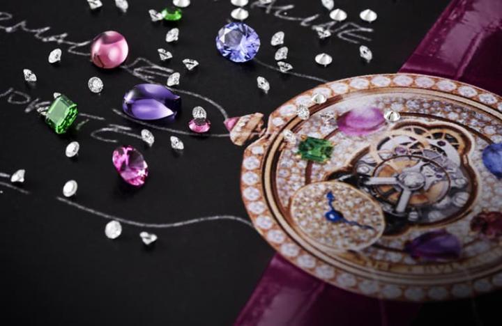 玫瑰金材质/FlyingT自动上炼机芯/偏心时、偏心分显示/陀飞轮装置/面盘与表冠镶嵌明亮切割钻石,约重0.24克拉/表壳与表扣镶嵌明亮切割钻石,约重2.80克拉/表款镶沙弗莱石(方形与圆形切割)2颗,约重 0.38克拉、碧玺(椭圆形与圆形切割)2颗,约重0.64克拉、椭圆形切割坦桑石1颗,约重0.47克拉、梨形切割紫水晶1颗,约重0.70克拉、圆形切割红碧玺1颗,约重0.39克拉/蓝宝石水晶镜面、透明底盖/防水30米/表径39x20mm/限量20只