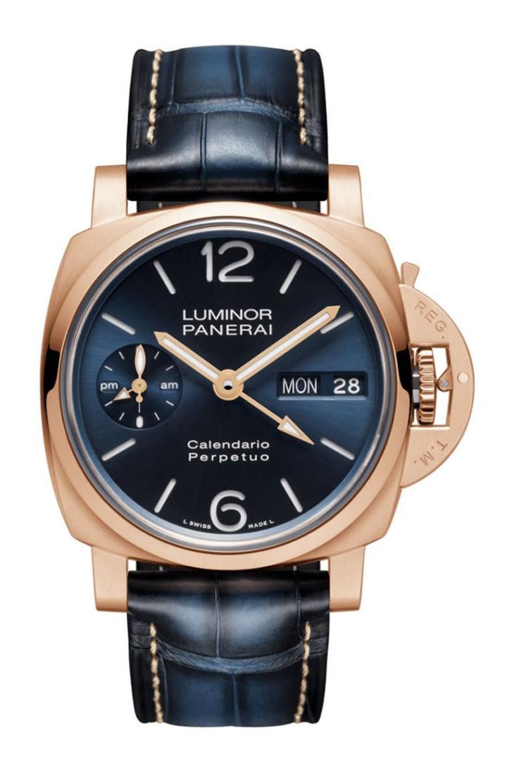 Luminor Perpetual Calendar以沛纳海独家的Goldtech™红金制作表壳,表径44mm以万年历等级的手表而言不算太大只,何况这种表径对品牌而言也早已司空见惯。Goldtech™据说在成分中添加更高比例的铜和铂金,所以表壳材质不仅色调更红润,得力于铂金的特性也提升了材质本身抗氧化、抗腐蚀的效果。Goldtech™红金款的Luminor万年历搭配的是沛纳海近年常见的蓝色面盘,连同鳄鱼皮表带也是蓝色;顺带一提,铂金款Luminor万年历则是采用绿色面盘搭配红棕色皮带,形成同中有异的视觉个性。