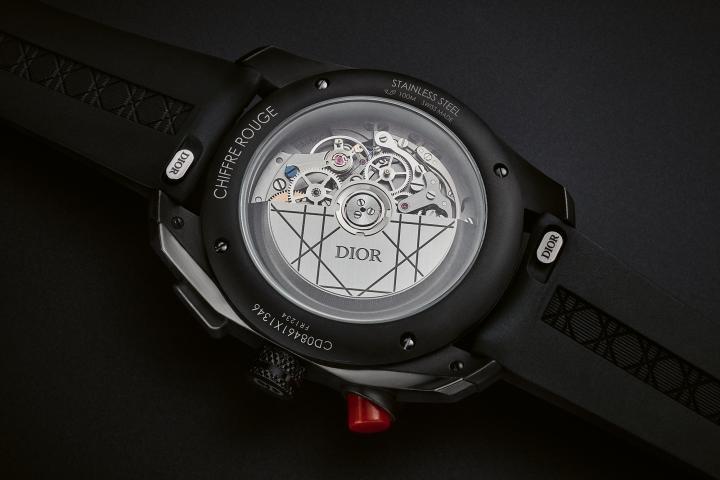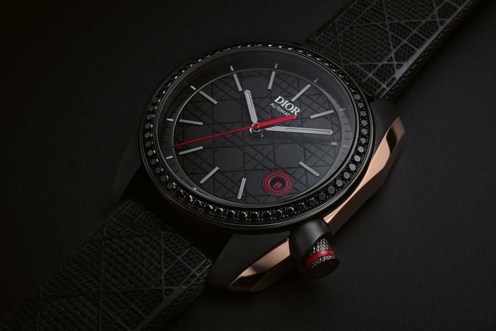 新款CHIFFRE ROUGE腕表承继原版标志性特色——别具一格的不对称美学,其表径分别为38mm和41mm。该腕表的另一个标志性特征是其表盘和背面的摆轮均饰以迪奥(Dior)标志性的 Cannage藤格纹。表壳经过黑色哑光DLC涂层处理,使得红色点缀显得格外耀眼。