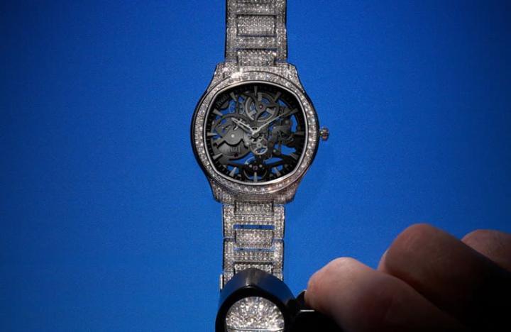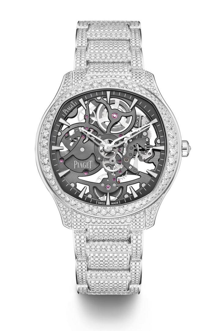 另款PIAGET Polo Skeleton钻石镂空手表也是奠基于PIAGET Polo系列的造型特征,例如“形中有形”的圆形表圈与枕形面盘,此外手表的白金表壳共镶上268颗明亮式切割钻石,而在H型一体式炼带表面更镶有1478颗钻石,据知伯爵共用上61个小时才将所有钻石镶嵌到位,展现品牌熟练且精湛的宝石工艺。表款面盘直接露出1200S1机芯样貌,它除了以镂空造型示人,整枚机芯仅2.4mm的厚度也非常纤薄。2021年时伯爵首度将1200P机芯改造为镂空版的1200S机芯,到了2022年品牌进一步发表1200S1镂空机芯,它蕴含了多项细节革新,包括抗磁效果提升且动力储存还是维持在44小时,石板灰色的机芯零件与白金镶钻表壳刚好形成明暗对比,造就手表层次鲜明的视觉感受。PIAGET Polo Skeleton钻石镂空手表虽然没有限量发行,但由于表款的钻石数量比Limelight Gala Aventurine多出许多,因此它的定价自然也是更上几层楼,让收藏家在一件物品上可以同时满足欣赏高级制表与高级珠宝工艺的欲望。