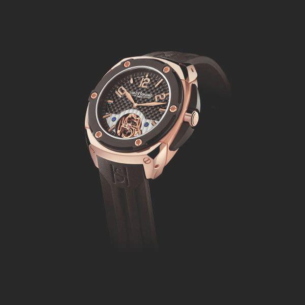 由Saint Honoré Haute Couture Collection推出的这款玫瑰金陀飞轮采用一只1885机芯,碳纤维表盘,表圈和钛金的可调节表扣。限量发售。