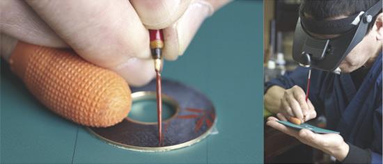 蒔絵,读音Maki-e,是一种日本“喷绘”装饰技艺。而其为所有烤漆工艺中,最为复杂的一种。图案设计是将金粉或银粉小心细致地喷涂在未干的漆上,通常为黑漆。